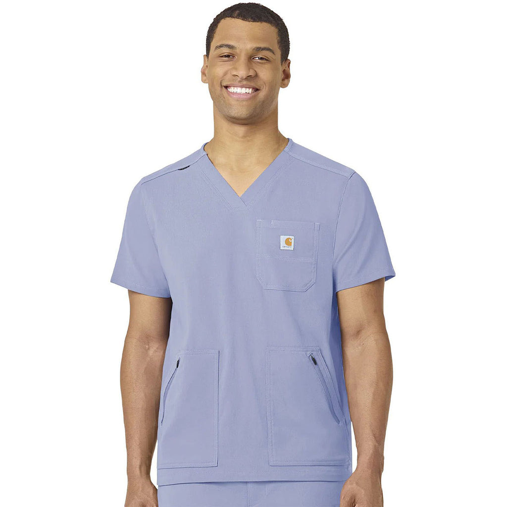Carhartt Men's Ceil Blue Modern Fit 5-Pocket V-Neck Top with a custom logo is a must-have for those who work in the medical industry, as vets, as techs, and much more. The durable top has stretch technology, water-repellency, and a chest pocket. Side vents keep you cool and allow you freedom of range of movement that is needed each day.