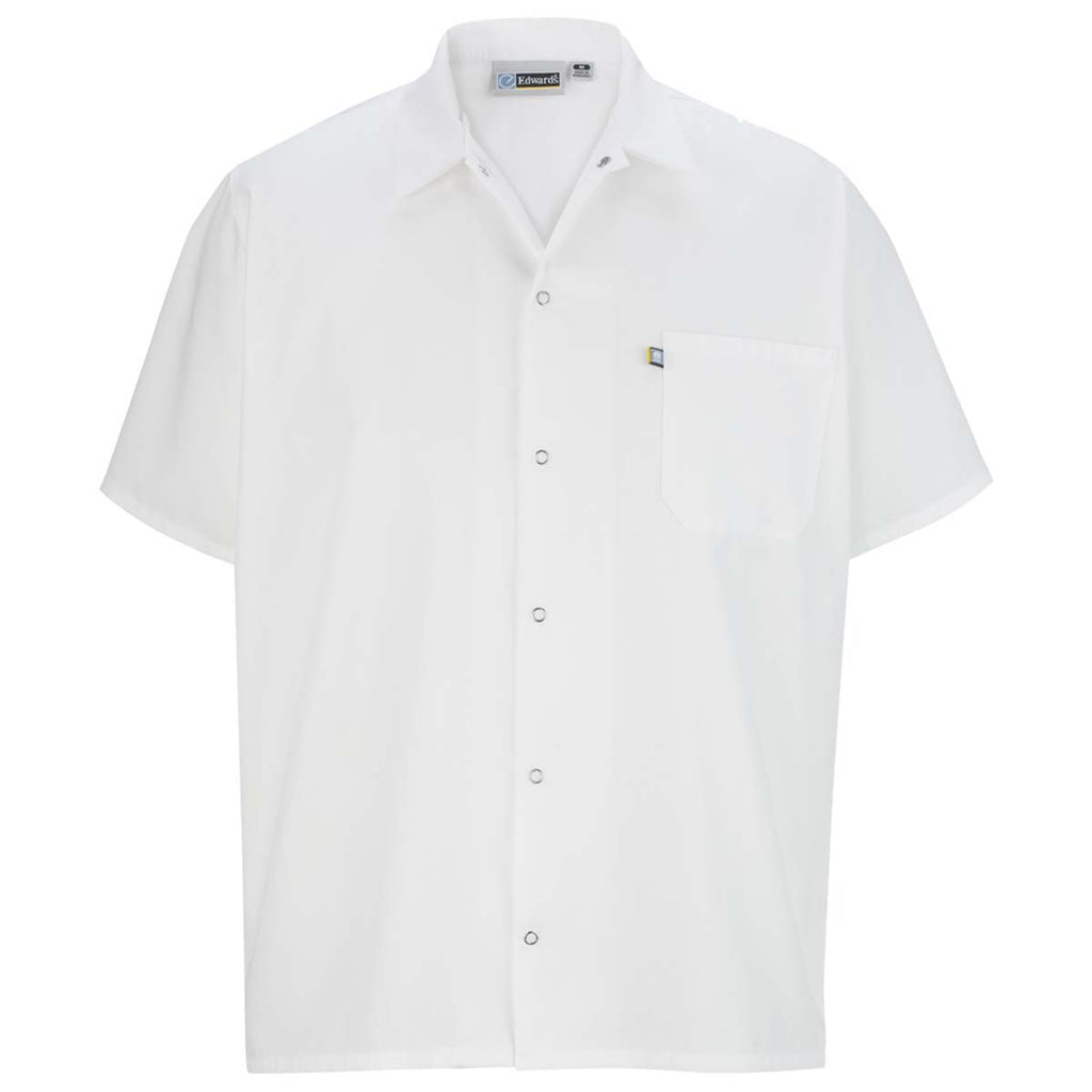 Your staff will look amazing in a custom embroidered Edwards Men's White Snap Front Shirt in bold black. Add your company logo or corporate embroidery to these snap front chef shirts for a professional look that is easy to wear and care for. Made of breathable polyester and cotton fabric this traditional look offers a chef collar and six snap placket for layering. Short sleeves and a left chest pocket mean even in the hottest environments, your staff will keep cool. Excellent as corporate uniforms or for your foodie friends.