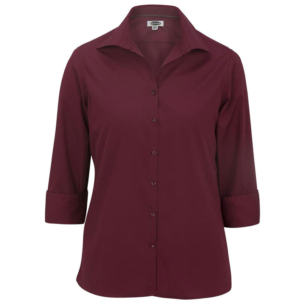 Your company logo will pop on the Edwards Women's Burgundy Lightweight Poplin Shirt made of lightweight polyester and cotton. The 3/4 sleeve blouse has an open neck with contoured side seams and back darts making it fashionable enough to be used as corporate apparel. Machine washable and wrinkle resistant means all day wear of this shirt will still have you looking and feeling great. Try out a custom logo to use at special events or to show support for a specific organization. The simple button-up is stylish and easy to care for no matter what your day holds.Highlights