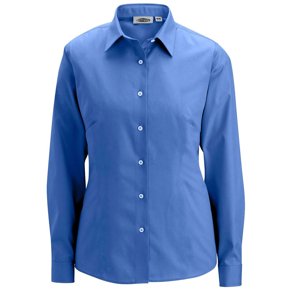 Choose your embroidery for the Edwards Women's French Blue Pinpoint Oxford to enjoy a lightweight professional look that will turn heads. The tailored fitting oxford offers light stripes for an eye-pleasing look. Add a company logo to use as corporate apparel or as employee apparel that will have employees looking polished and professional. The wrinkle free fabric looks great even when your hours are long and the spread collar has permanent stays to maintain appearances. Princess back seams and a curved hem on the machine washable oxford gives this long sleeve shirt a feminine flair that can be worn alone or paired with a sweater or blazar.Highlights