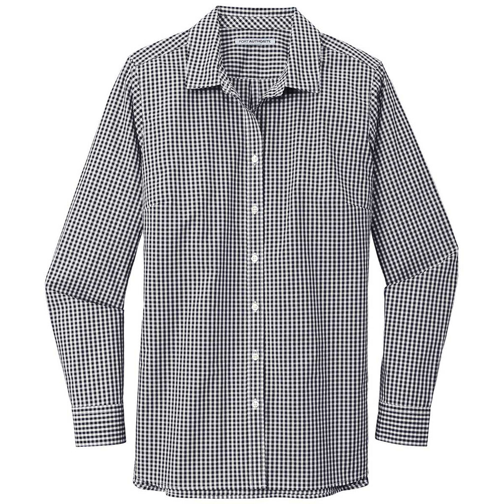 Have a bit of custom fun with the Port Authority Women's Black/White Broadcloth Gingham Easy Care Shirt. You can banish the boring with a bold gingham print and an embroidery of your choosing. Add a custom logo to this wrinkle resistant shirt to establish a look that could serve as a company uniform or just rock the next corporate event. Made of a cotton, poly blend with pearlized buttons, bust darts, and back pleat, this gingham creation has stepped away from the farm and taken charge of the office. Perfect as end of the year gifts for those who are bold enough to stand out each day.Corresponding Men's Style:Port Authority Men's Black/White Broadcloth Gingham Easy Care Shirt