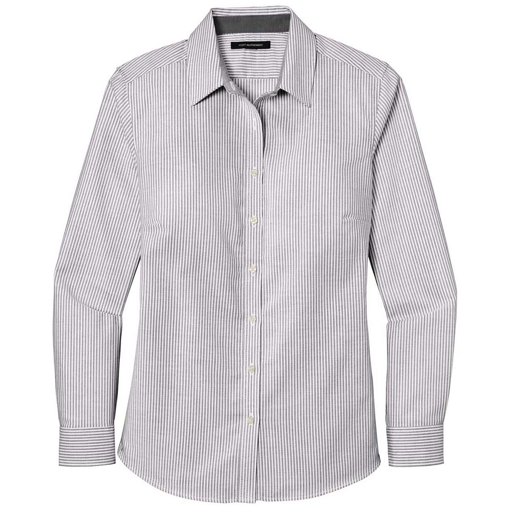Elevate your look with a custom logoed Port Authority Women's Black/White SuperPro Oxford Stripe Shirt. This simple, classic Oxford is a must have addition for most wardrobes. Add a company logo to use as corporate apparel alone or with a jacket or as employee apparel for that approachable, yet professional look. The gorgeous, subtle stripe on the cotton poly blend is wrinkle resistant, stain resistant, and offers stain release. Designed to look good from morning to night, this Oxford is one that can go from work to a night out with just a few simple accessory changes.Corresponding Men's Style: Port Authority Men's Black/White SuperPro Oxford Stripe Shirt