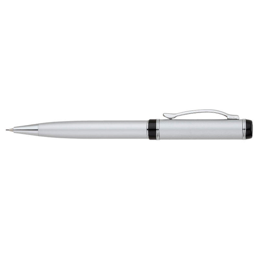 Jot down work notes or record an epic diary with this modernized classic twist-action set of Logomark Silver Zara Ballpoint/Pencil Set which comes in a zippered case. You can have your logo custom engraved on the chrome-accented clip of both pen and pencil.