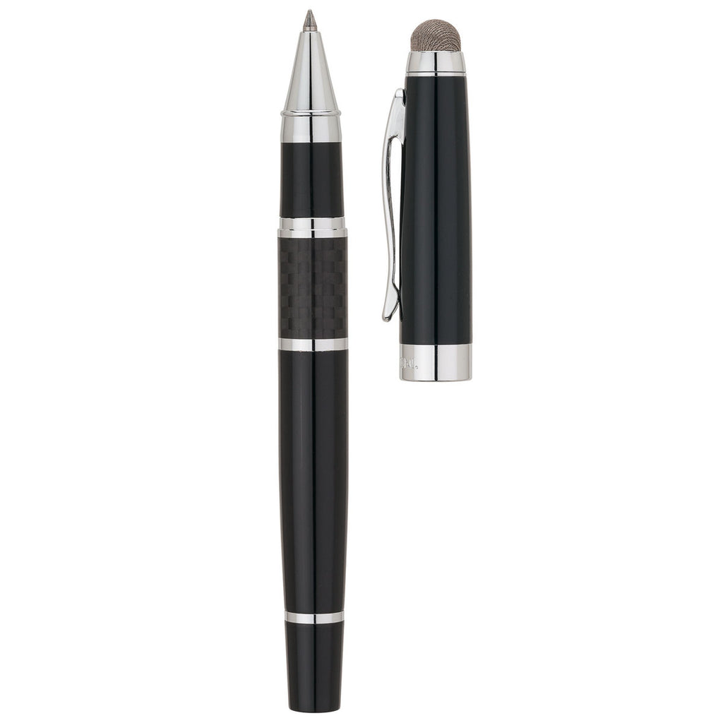 Laser engraved with your company's logo or tagline, this Bettoni Black Caserta Rollerball Pen & Stylus brings spirit to an everyday accessory. Features a conductive fiber stylus tip for use with your favorite touchscreen device. It's a pen that customers and customers will keep with them to use over and over again and is sure to make a lasting impression on a recipient after you customize it with your company's logo.The minimum order for this product is 50 pieces.