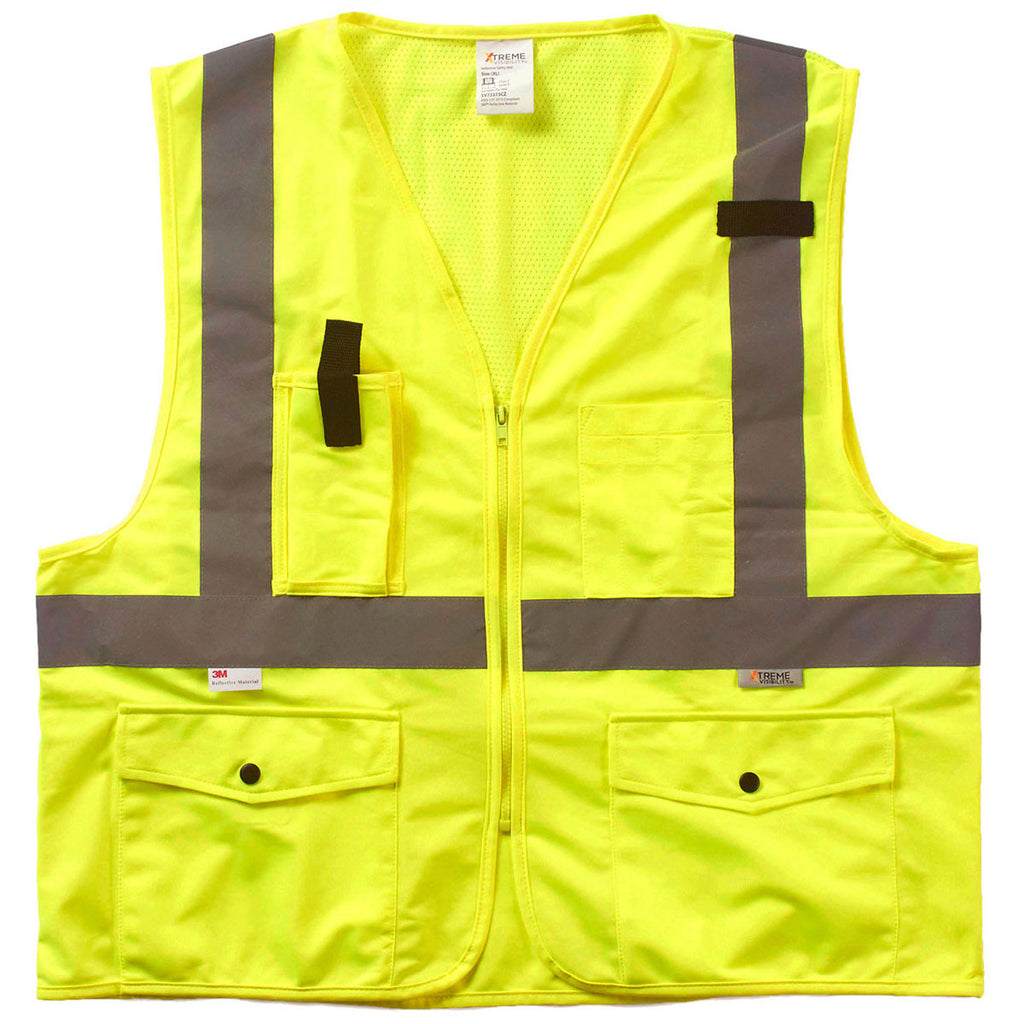 Choose unique embroidery for the Xtreme Visibility Unisex Yellow Surveyor Class 2 Zip Vest for employee apparel that will get others to take notice. The ANSI 107-2015 compliant yellow fabric has a solid tricot front with mesh fabric on the upper back for air circulation. Add a company logo to the vest with zipper that features a mic tab, radio chest pocket, and large external back pocket for a tablet. In addition, there are two front snap pockets, two internal pockets, and a chest pocket for pens. This vest has it all when it comes to safety and convenience. Place an order today for your company.Highlights