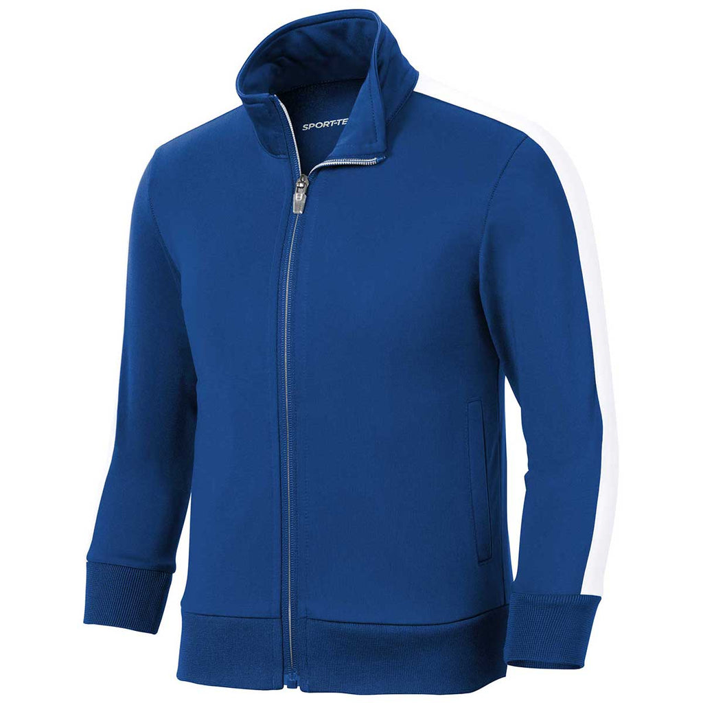 Be ready for the big event with a custom Sport-Tek Youth True Royal/White Tricot Track Jacket. Add a custom embroidery to the color and sizes you need to build team spirit for a team event or create a custom logo to represent your team. Made of 100% polyester tricot with soft brushed backing and rib knit cuffs and hem, this track jacket is perfect as warm up gear or every day wear. The cadet collar and pieced stripe on the shoulders and sleeve offer that classic look that everyone will recognize. Front pockets keep small items close at hand as you go about the day.Highlights