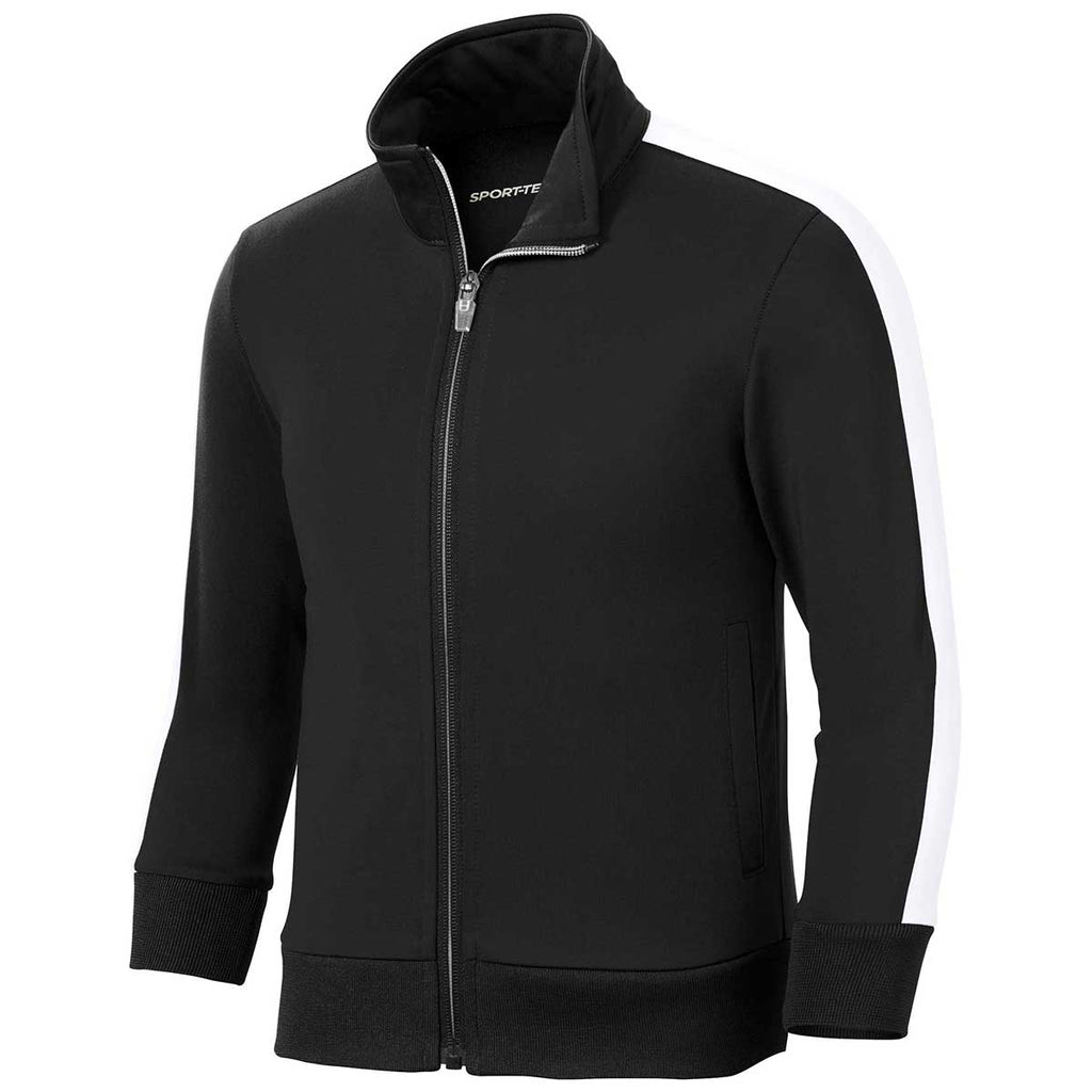 Be ready for the big event with a custom Sport-Tek Youth Black/White Tricot Track Jacket. Add a custom embroidery to the color and sizes you need to build team spirit for a team event or create a custom logo to represent your team. Made of 100% polyester tricot with soft brushed backing and rib knit cuffs and hem, this track jacket is perfect as warm up gear or every day wear. The cadet collar and pieced stripe on the shoulders and sleeve offer that classic look that everyone will recognize. Front pockets keep small items close at hand as you go about the day.Highlights