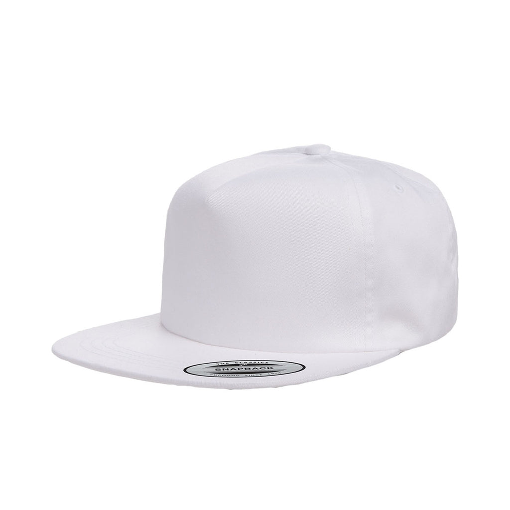 With flat bills becoming the new fashion rage, it is not surprising the custom logoed Yupoong White Unstructured 5-Panel Snapback Cap is one of our most popular hats. Blended cotton and polyester offer supreme comfort and long lasting durability. Five unstructured panels produce a laid back look that puts everyone around you at ease. The high profile allows you to see more of what is around you. Adjust the plastic closure to ensure the most comfortable fit for all day use. Attach your corporate logo on the large imprint area to generate buzz for your company in the community.Highlights