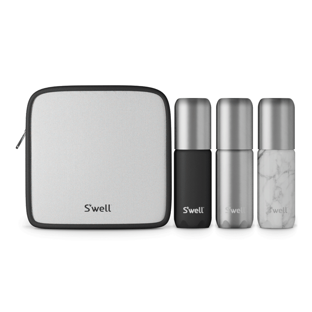- Set includes three TSA carry-on approved size (3.4oz) S’well Travel Bottles and a toiletry bag made from recycled plastic.