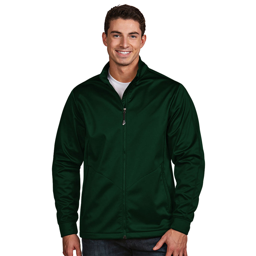 Designed for golfers of all skill levels, the corporate logoed Antigua Men's Dark Pine Golf Jacket makes the perfect gift for everyone who signs up for the next company sponsored golf outing. Just remember to add a custom logo to help players remember the products and services your company offers. Enjoy the waterproof polyester fabric that resists rips and tears. Dyed to match taping detail at the collar, sleeves, shoulders, and hand pocket flap create a sleek appearance that shows you like to golf in style. Moisture wicking technology keeps you cool and comfortable during an intense round, and doesn't impede your ability to win.Corresponding Women's Style: Antigua Women's Dark Pine Golf Jacket