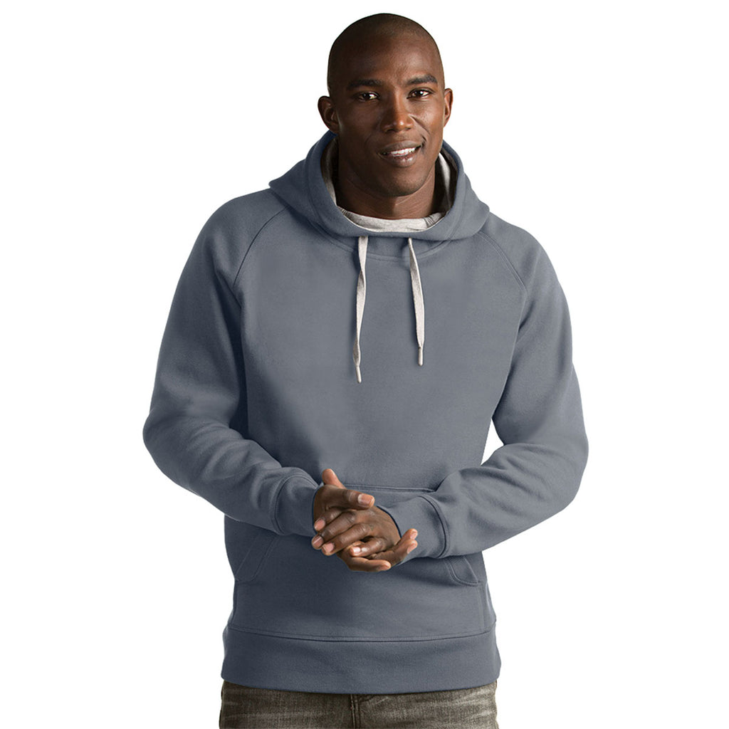 From the gym to the great outdoors, the custom embroidered Antigua Men's Grey Heather Victory Pullover Hoodie delivers superior performance in all types of climates. Moisture wicking technology quickly removes any discomfort to keep you feeling energized during extended backpacking excursions. Cotton and polyester combine to produce a durable fabric that retains body heat during cold weather outbreaks. Add your company logo on the large imprint area to make your brand better known at industry trade shows and events. Great for long travel days, the Antigua Victory Hoodie is a comfortable and cost effective option for your next custom apparel purchase.Highlights