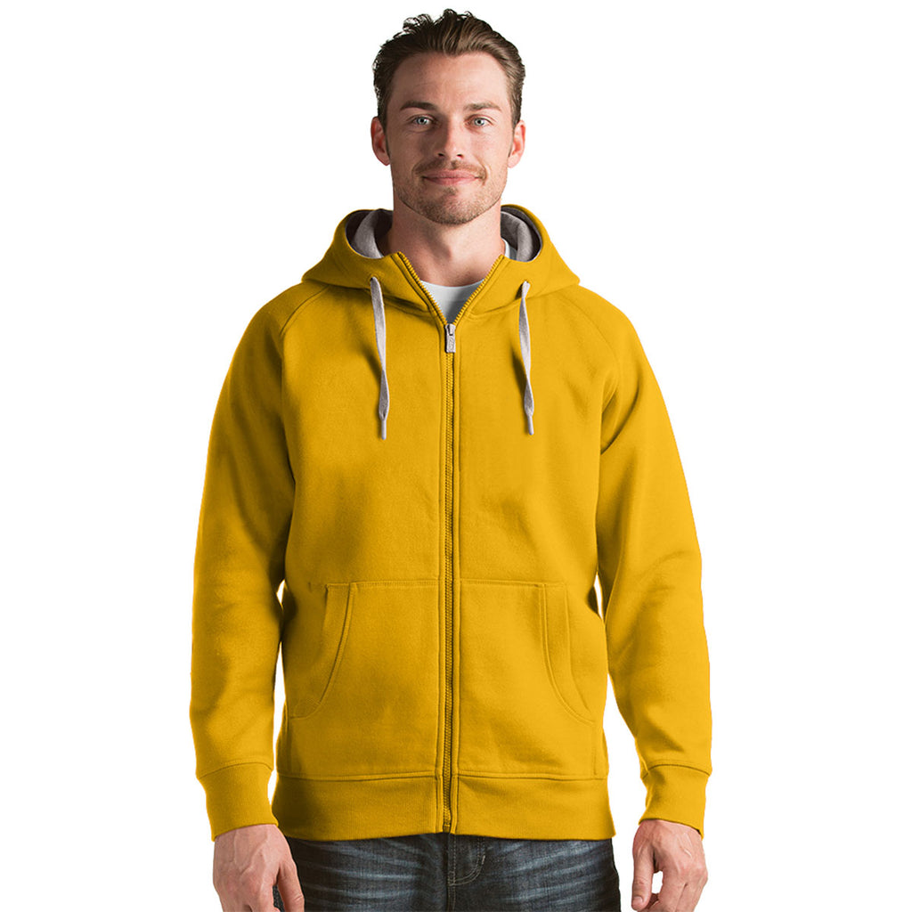 The custom Antigua Men's Gold Victory Full Zip Hoodie is the perfect companion for your company logo. Super soft cotton blends with highly durable polyester to create the ideal outer layer for both camping trips and golf tournaments. Not to mention a great layering piece for a long day of business travel. Cover stitching at the rib cuff and bottom hem adds a stylish design element to the hoodie. Attach a custom logo on the large imprint area to increase your brand awareness at industry events and recruiting outings. Your team will be more than happy to wear this comfortable full zip during the work week and on the weekends.Corresponding Women's Style: Antigua Women's Gold Victory Hoodie