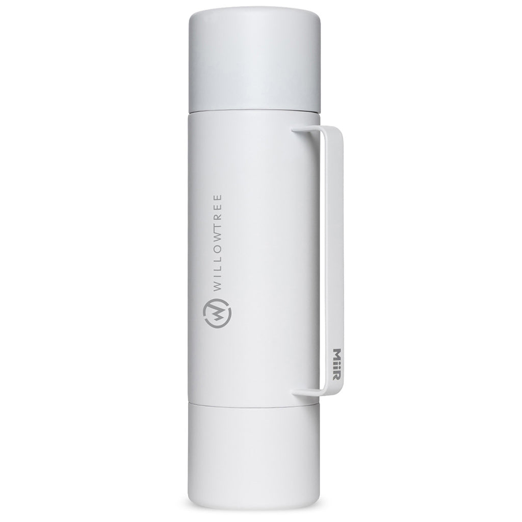 The MiiR White Powder Tomo - 33 Oz. has a sleek, minimalist design that will elegantly showcase your company's custom logo or design. This double-wall vacuum insulated vessel will keep any liquid stored inside hot or cold for up to hours. It also includes a convenient carry handle and two sipping mugs.