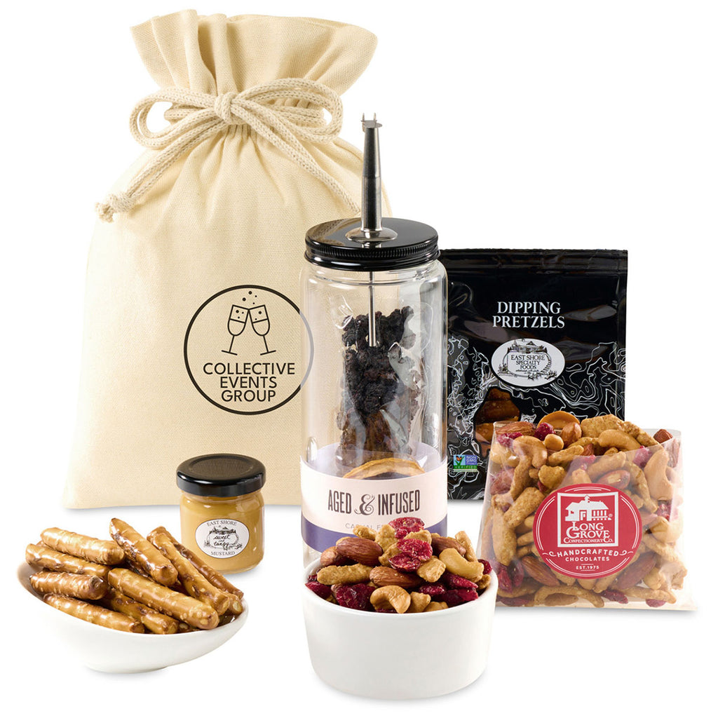 The Gourmet Expressions Cobalt Blue Executive Decision Aged & Infused Cocktail or Mocktail Gift Set is a contemporary snack set that is perfect for upscale audiences. Add your company's custom logo or design to the high-quality drawstring bag, which Includes delicious gourmet snacks and a DIY drink kit.