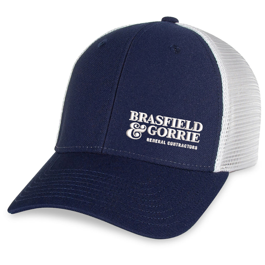 Merrimack Hat Co. Navy/White Casey Trucker custom cap is a fan favorite with the breathable mesh backing and antibacterial headband. The snapback closure is adjustable for most sizes, making it a wonderful promotional item for recruiting events or trade shows. Choose the color combination you like most and get started on an order.