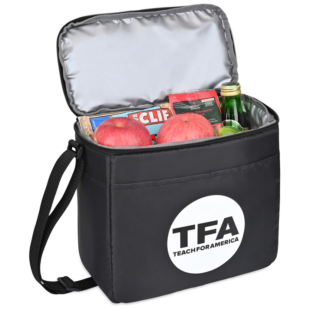 Gemline Black Arlo rPET 9 Can Box Cooler with a corporate logo is a perfect promotional item that will be used on all types of adventures. Whether going to a sporting event, hiking, or to a picnic in the park, this box cooler has a zippered main opening and a front pocket for a few extra snacks or your phone and keys.The minimum order for this product is 50 pieces.