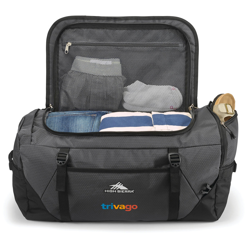 High Sierra Mercury/Black Fairlead Convertible Duffel with a custom logo is an upgraded classic that will keep you organized and ready to go. Perfect for overnight travel, gym clothes, or even overnight sporting events, this duffle converts to a backpack when needed for easy transport. Choose this durable option for your next adventure.