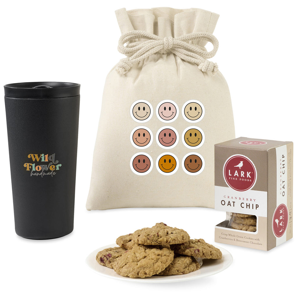 Treat yourself and others with a custom Gourmet Expressions Black Sip, Snack & Inspire Gift Set. This gift set comes in several color options and includes a new Aviana recycled 17 ounce tumbler, salted caramel chocolate chip cookies, and a medium drawstring bag that can be used later on for other items.