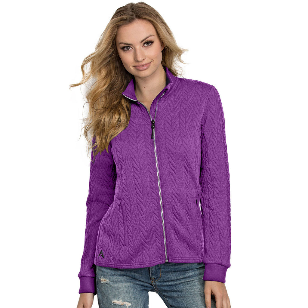 Stay toasty on those cool days with the Antigua Women's Boysenberry Destination in solid jacquard sweater pattern. Created from polyester and spandex with double knit quilt, this full zip jacket is a must have for a golf event or traveling back and forth to the office. Add a company logo or corporate embroidery to showcase your company or team. Perfect when you are on the go, the dyed to match rib, collar, and cuffs add style while the invisible hip pockets add functionality. So whether you need a light weight jacket at the next recruiting event or something that draws attention at the trade show, the Antigua Women's Boysenberry Destination is the right choice.