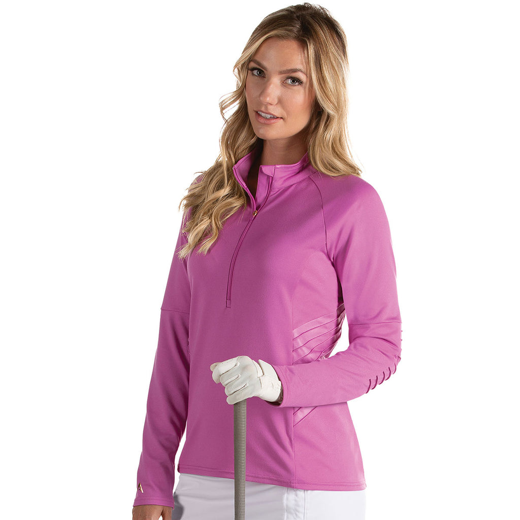 Practicing your putt has never looked as good as with the Antigua Women's Jam Luxe micro brushed half zip pullover. Though the Antigua "A" logo at the bottom hem shows style, a custom logo will show company or team pride with flair. Available in five basic and bold colors the side edging adds a bit of something extra to an already professional, yet comfortable pullover. Made of polyester and spandex, this pullover could serve as employee apparel with a carefully placed company logo. So, whether you are planning a recruiting event or have a booth at an upcoming trade show, choose your colors and custom embroidery with care to showcase your company in the best light. Antigua will get you noticed.