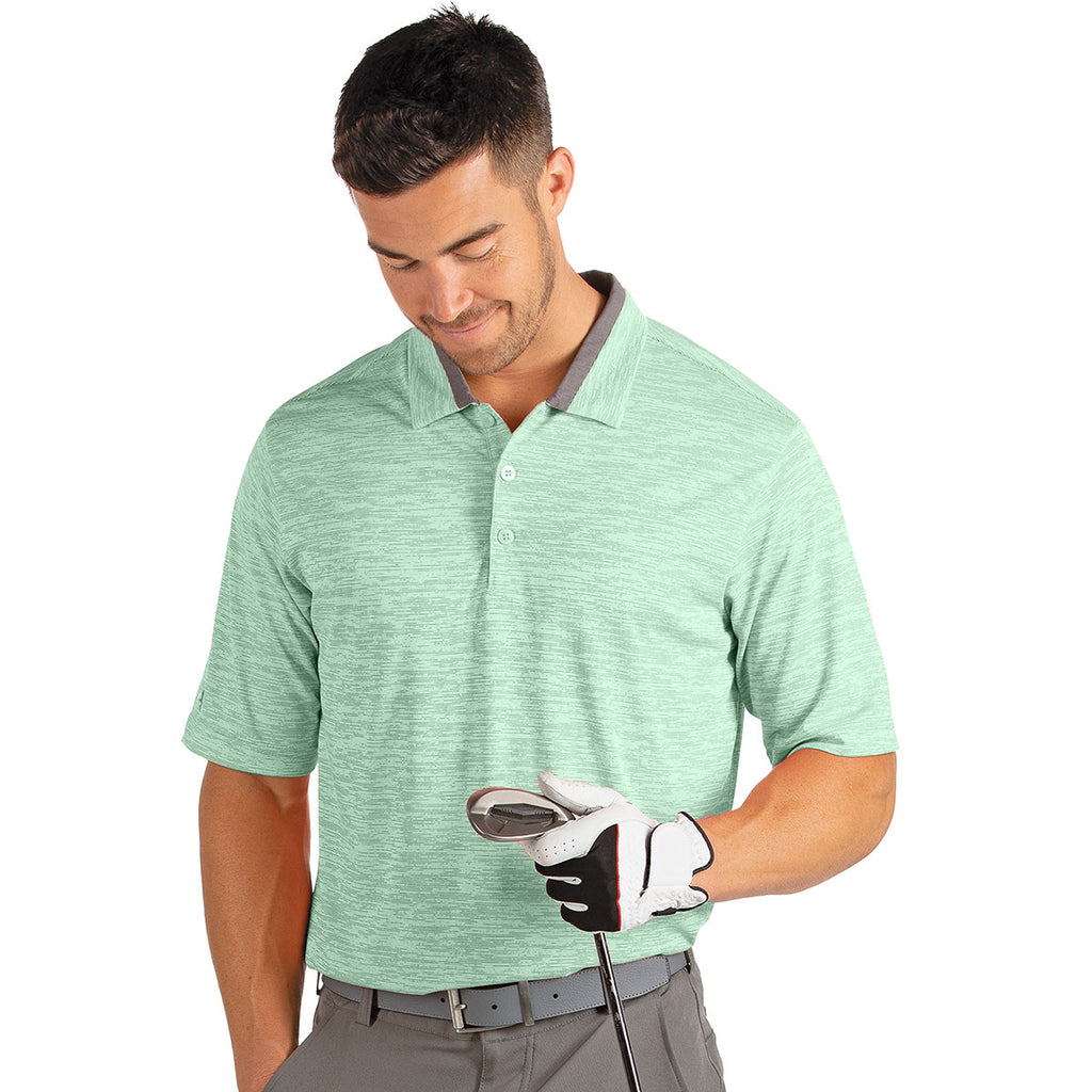 Custom polo shirts are a must have for those in the business world and Antigua Men's Jade/Bedrock Nassau is no exception. Whether you have a big golf event coming up or need to look great while giving a presentation over lunch, one of the creative colors will fit the bill. Add a custom logo to show company pride or team spirit depending on your individual and group needs. Perfect to wear with a pair of khakis, the 100% polyester polo with a Desert Dry moisture wicking space dye pattern has woven trim detail and a classic Antigua triangle patch on the right sleeve. Place your order now to be prepared for your upcoming event.
