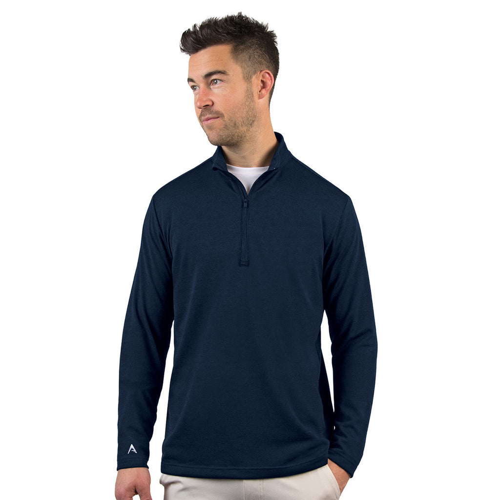 Antigua Men's Navy Bonsai heavy weight pullover with long sleeves is perfect for those cooler days spent at golf events. Add a company logo and use these quarter zip pullovers as part of employee apparel for those who need to be both in and outdoors during the work day. Made of a polyester rich, spandex blend the Desert Dry moisture wicking makes this custom logoed pullover a must have when the weather starts to turn. Perfect for a trade show or recruiting event, the open cuffs and bottom hem allow for all day comfort. Place your order before the next big event.Corresponding Women's Style: Antigua Women's Navy Bonsai