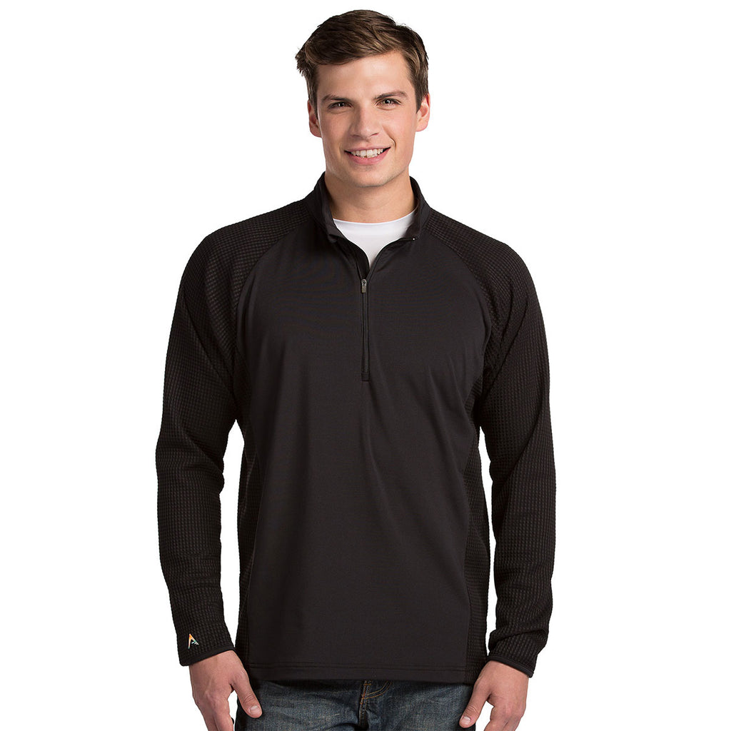 The seasons are changing, stay comfortable with the Antigua Men's Black Sonar quarter zip pullover. Made of a polyester, spandex blend, the quarter zip pullover is a great option for employee apparel especially at recruiting events and trade shows when the weather can get chilly throughout the day. Add a company logo to build brand recognition every time this moisture wicking pullover is worn or displayed. The heavy weight waffle inserts, raglan armholes, open cuff and hem add to the stylish simplicity that makes this pullover a favorite. Place your order before the next big event to have yourself and employees display a look that will turn heads.Corresponding Women's Style: Antigua Women's Black Sonar