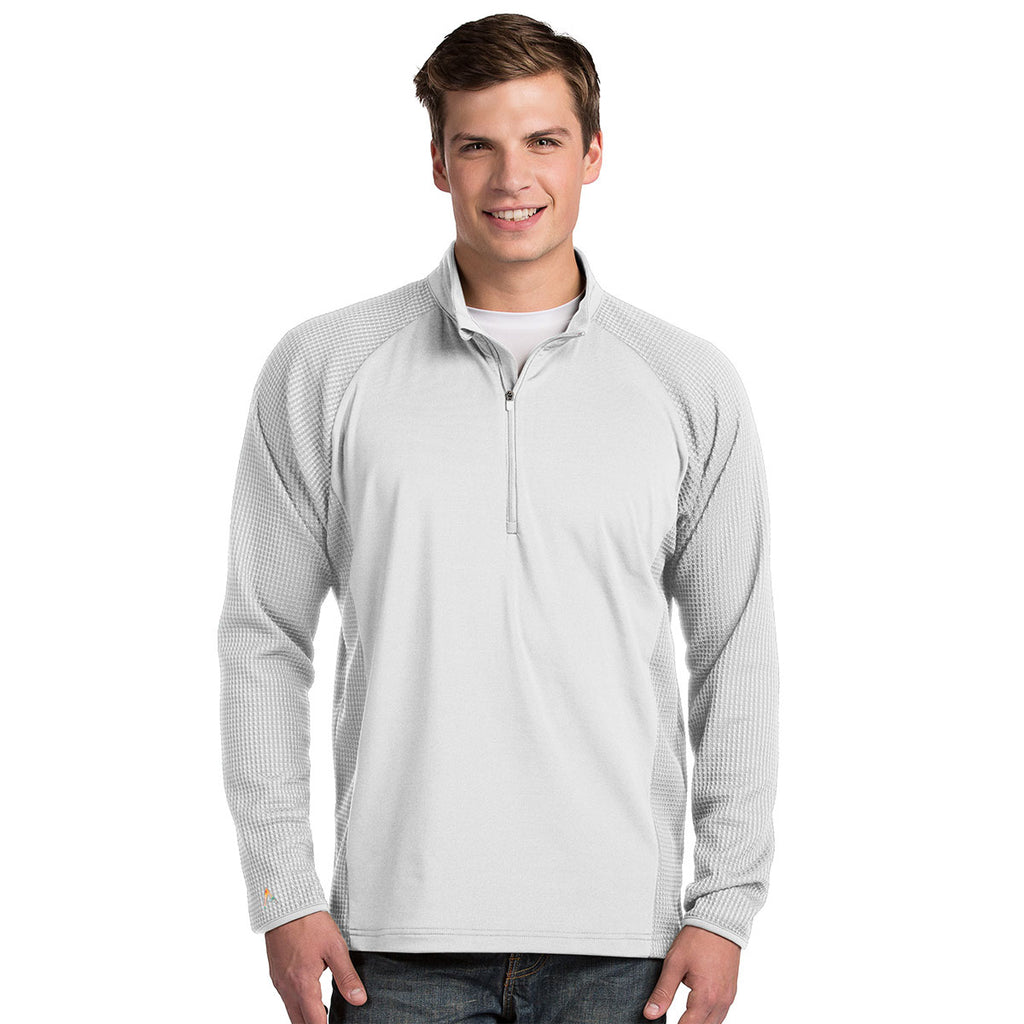 The seasons are changing, stay comfortable with the Antigua Men's White Sonar quarter zip pullover. Made of a polyester, spandex blend, the quarter zip pullover is a great option for employee apparel especially at recruiting events and trade shows when the weather can get chilly throughout the day. Add a company logo to build brand recognition every time this moisture wicking pullover is worn or displayed. The heavy weight waffle inserts, raglan armholes, open cuff and hem add to the stylish simplicity that makes this pullover a favorite. Place your order before the next big event to have yourself and employees display a look that will turn heads.Corresponding Women's Style: Antigua Women's White Sonar