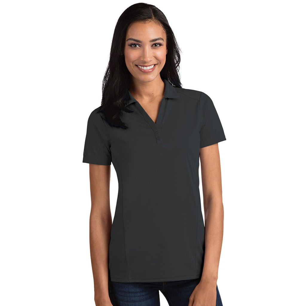 Look great while keeping cool in the Antigua Women's Smoke Tribute polo made of 100% polyester. Available in a wide variety of colors and sizes, this Desert Dry moisture wicking knit solid will carry your custom logo with pride and flair. Choose the custom embroidery that best fits your company and offer these shirts as employee apparel for those working in your office or the next trade show. Perfect for nearly any recruiting event, this polo would make a great gift or a go-to choice with 2-botton Y-placket, princess seams, and an open cuff. The possibilities are only as limited as your imagination. Place your order today in time for the next event.Corresponding Men's Style: Antigua Men's Smoke Tribute