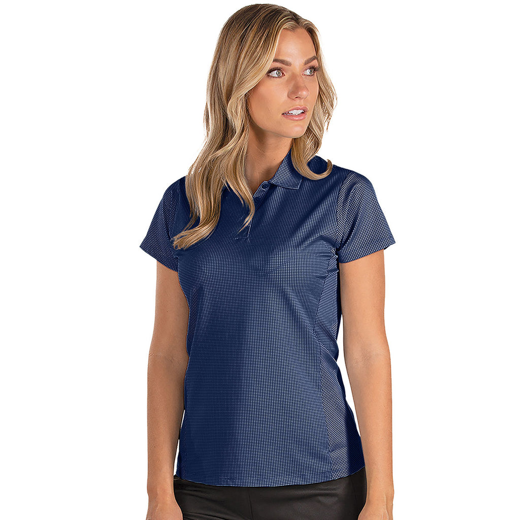 Professionalism meets style in the Antigua Women's Light Navy/Navy Scope with short sleeves. Idea for the office, trade shows, or just to look and feel your best, this spandex, polyester blend offers princess seams and a self-collar. Available in a range of sizes, the Women's Scope can be embroidered with your corporate logo or custom design. Imagine the excitement if these were offered at your next recruiting event or the team spirit felt at a golf event. Start choosing the colors and design for your custom polo shirts today to place your order. You and your employees will feel great and look even better with this addition to the wardrobe.Highlights