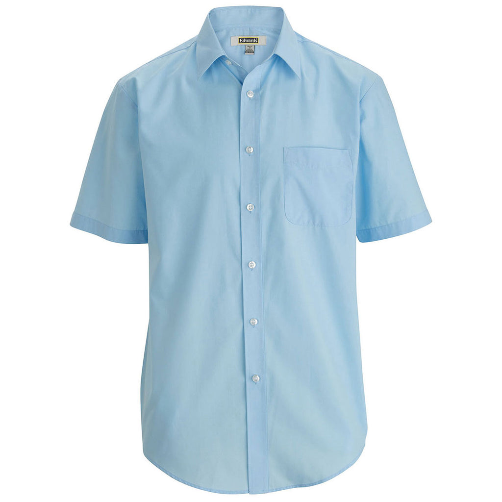 Choose embroidery for the Edwards Men's Blue Essential Broadcloth Shirt for a high-end look that is ready for work. The short sleeve, lightweight shirt has an improved fit and is wrinkle resistant. Add a company logo to use as uniforms for those interacting with customers daily or as corporate apparel that can easily paired with a suit or jacket. The straightforward button-up has a point collar with permanent stays, a straight back yoke seam, and is machine washable. Try out a custom logo to add to your logoed apparel line with a business casual section.Highlights