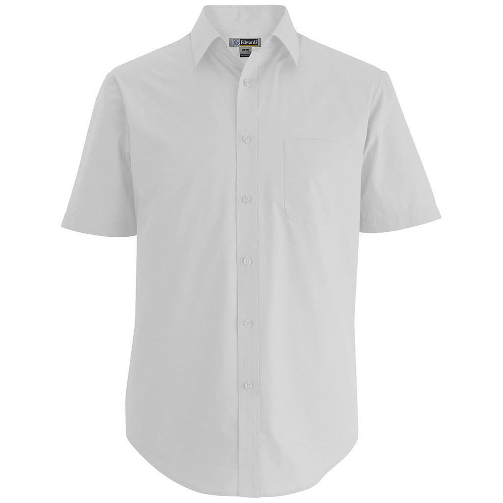 Choose embroidery for the Edwards Men's White Essential Broadcloth Shirt for a high-end look that is ready for work. The short sleeve, lightweight shirt has an improved fit and is wrinkle resistant. Add a company logo to use as uniforms for those interacting with customers daily or as corporate apparel that can easily paired with a suit or jacket. The straightforward button-up has a point collar with permanent stays, a straight back yoke seam, and is machine washable. Try out a custom logo to add to your logoed apparel line with a business casual section.Highlights