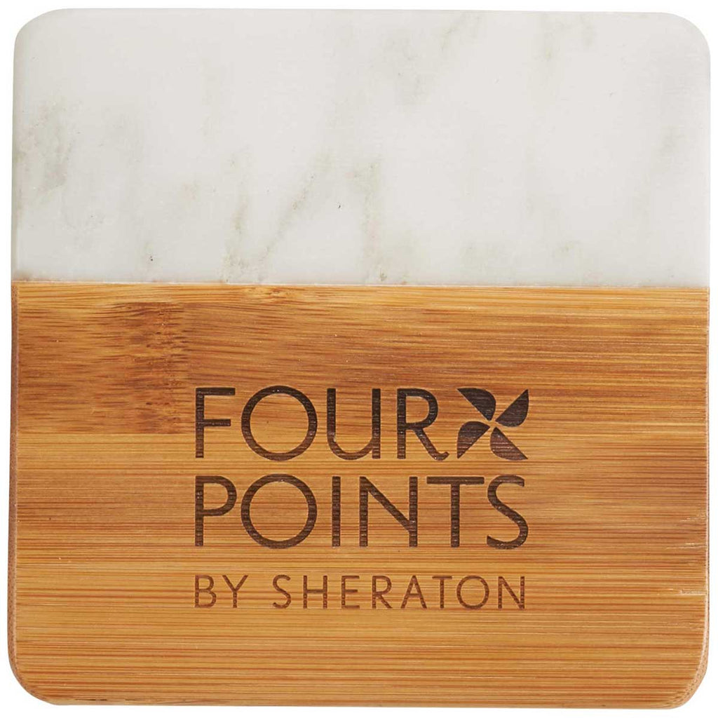 Looking for unique logoed event giveaways? The Leed's Natural/White Marble and Bamboo Coaster Set in this collection is just about what you need. All four coasters in this set can be refashioned to showcase your custom logo or name - just let us know, and we'll engrave your message on the wood panels to create a strong, professional-looking advertisement of your brand. These trendy coasters are also perfect as souvenirs for trade shows, recruiting events and the like.