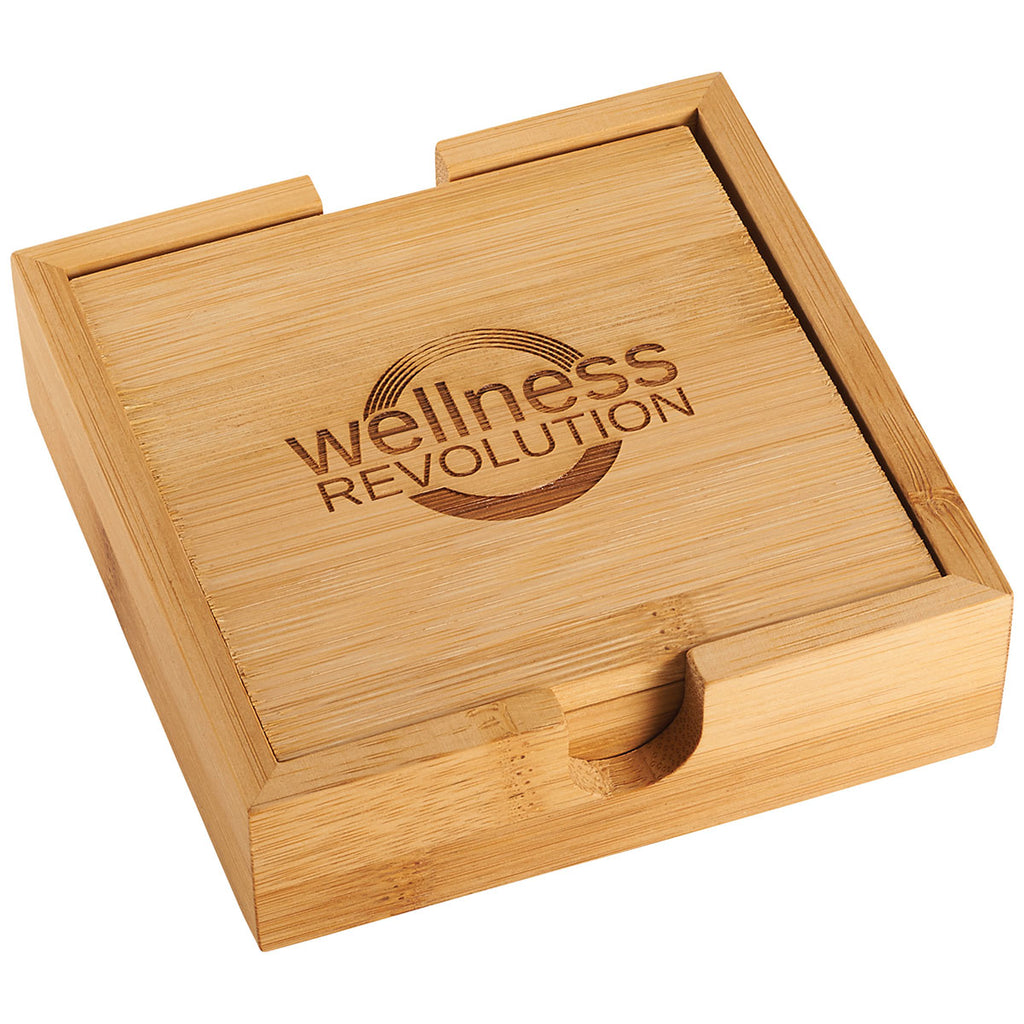 This elegant Leed's Natural Bamboo Coaster Set will look even better when they're laser engraved to include your company's custom logo. A unique employee gift - especially for team members who are now working from home - this stylish set includes four wooden coasters and a caddy to put them on display.The minimum order for this product is 48 pieces.