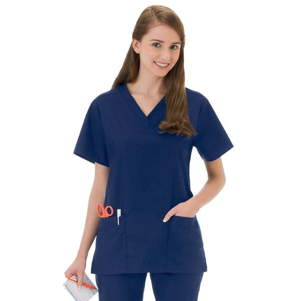 Treat yourself to the style and laid-back silhouette of White Swan Women's Navy Fundamentals V-Neck Top featuring the comfort of everyday durable fabric. Crafted from polyester-cotton breathable blend with poplin making wrinkle-resistant. Soil-release finish helps to keep it clean and stain free. Relaxed fit makes this top easy to get on and off. Side slits and set in sleeves allow breathability and ease of movement. Two generous pockets carry essential gear. Customize this scrub top to make it uniquely yours with an embroidered logo or unique font for healthcare staff in your organization.Highlights