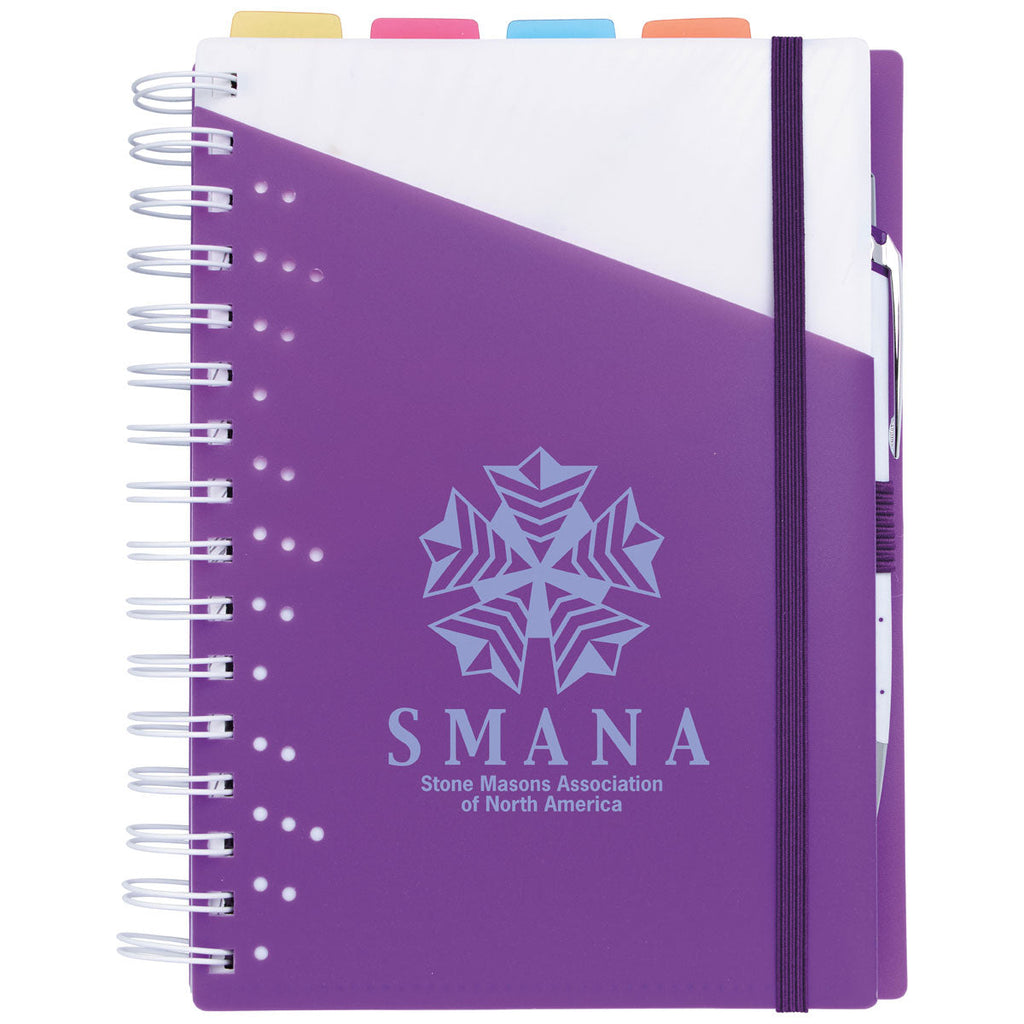 Stay organized with a custom Souvenir Purple Notebook with Vertex Pen. This small notebook with your custom logo and a matching white barreled pen will be a big hit with students, employees, and clients. The metal ring notebook with elastic closure has tabs to help you keep organized and a simple pen holder is just the right size for the Vertex pen. The notebook itself is dual colored for style and the simple lined pages are excellent for note taking. Perfect for event giveaways or as prizes for a big event. Place an order right away to make sure you do not miss out on this combination option.