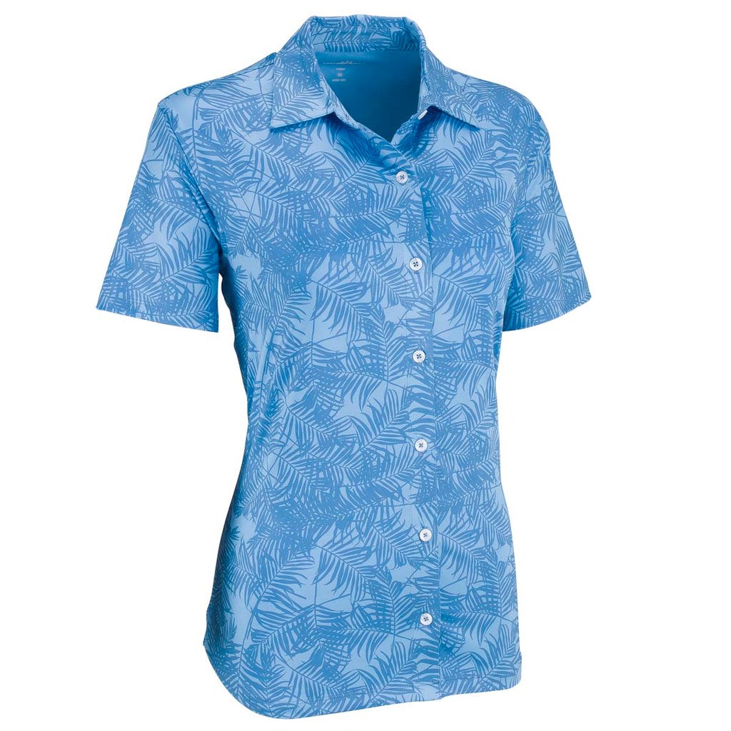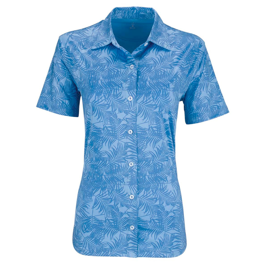 A vacation vibe with a custom embroidered logo comes together in the Vansport Women's Ocean Blue Pro Maui Shirt in three vibrant colors. The tonal palm print in the camp style polo is perfect for golf events or as corporate uniforms at a tropical location. Add a corporate embroidery to give these button ups as company gifts or simply to enjoy at home on those rare relaxing days. Made of a polyester rich spandex blend for freedom of movement this is a true, fun, must have for most wardrobes.Corresponding Men's Style: Vansport Men's Ocean Blue Pro Maui Shirt
