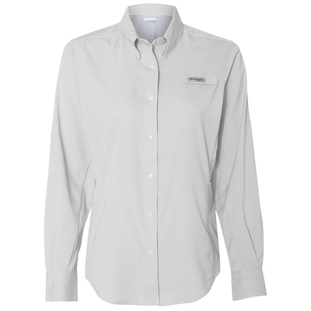 Columbia Women's Cool Grey PFG Tamiami Long Sleeve Shirt with a corporate logo is ideal for trail guides, adventurers, and those who work hard daily. Made of polyester ripstop with sun protection and Omni-WICK with a vented back, this is a must-have for those who need something tough yet comfortable for all-day wear.
