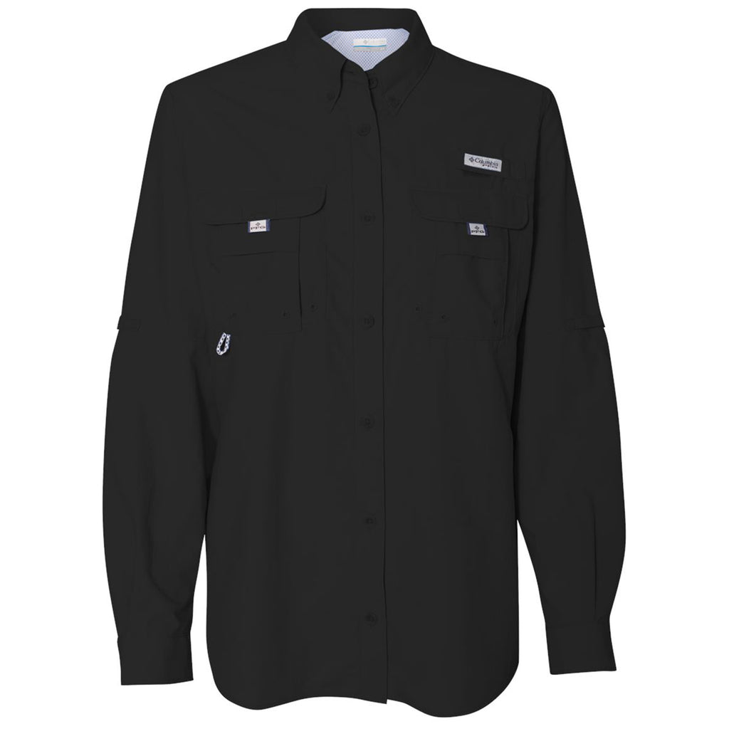 Columbia Women's Black PFG Bahama Long Sleeve Shirt with embroidery is a durable way to enjoy being outdoors. The 100% Tactel nylon is tough yet comfortable for all-day wear. Made with Omni-SHADE UPF 50 sun protection and quick dry technology with a vented back, this is a must-have for those who work and play hard.