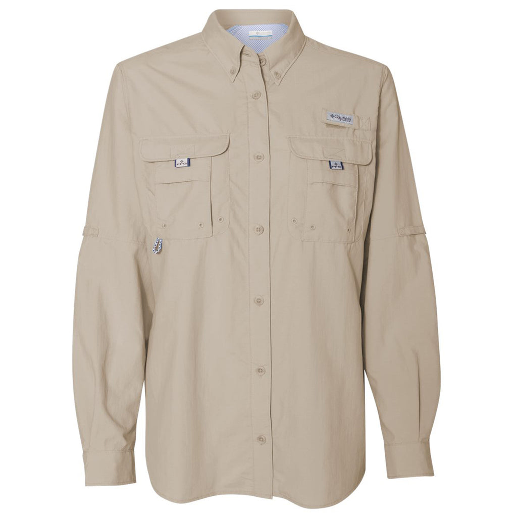 Columbia Women's Fossil PFG Bahama Long Sleeve Shirt with embroidery is a durable way to enjoy being outdoors. The 100% Tactel nylon is tough yet comfortable for all-day wear. Made with Omni-SHADE UPF 50 sun protection and quick dry technology with a vented back, this is a must-have for those who work and play hard.