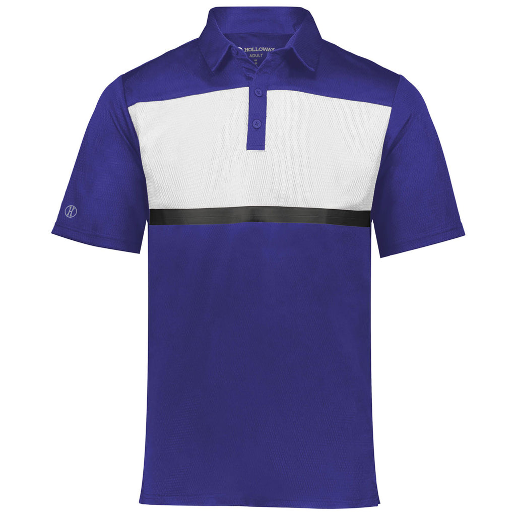 Holloway Men's Purple/White Prism Bold Polo with embroidery is a must have for those who want to get noticed. The lightweight polyester wicking honeycomb knit has a bold look with a solid base and large block print on the chest in a complementary color. Created for the outdoors, this short sleeve polo has a UPF of 50+ and side vents to keep you cooler and provide fit. Add a company logo to use as employee apparel or something custom to use while enjoying a round of golf with friends. The three-button placket and self-fabric collar bring together this look that can go from the boardroom to the bar with ease. Place an order today.Corresponding Women's Style:Holloway Women's Purple/White Prism Bold Polo