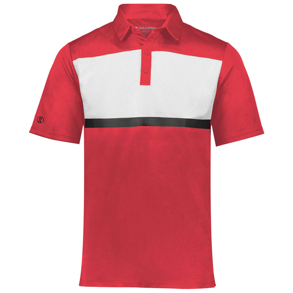 Holloway Men's Scarlet/White Prism Bold Polo with embroidery is a must have for those who want to get noticed. The lightweight polyester wicking honeycomb knit has a bold look with a solid base and large block print on the chest in a complementary color. Created for the outdoors, this short sleeve polo has a UPF of 50+ and side vents to keep you cooler and provide fit. Add a company logo to use as employee apparel or something custom to use while enjoying a round of golf with friends. The three-button placket and self-fabric collar bring together this look that can go from the boardroom to the bar with ease. Place an order today.Corresponding Women's Style:Holloway Women's Scarlet/White Prism Bold Polo