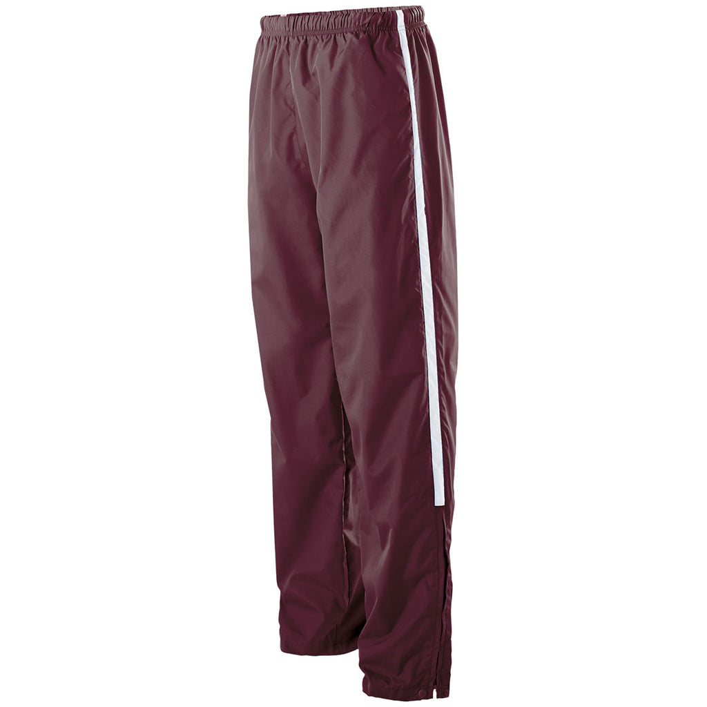The elasticized draw string waist feature for the embroidered Holloway Men's Maroon/White Sable Pant allows you to achieve the most comfortable fit. Open bottom hems altered by snaps and zippers provide the ultimate in corporate apparel flexibility. Wear the chic pair of pants to a business meeting and then go straight to an outdoor concert for a night of relaxing entertainment. One-hundred percent polyester resists the types of rips and tears that put unsuspecting buyers of other styles of pants in embarrassing situations. Attach a custom logo on the large imprint area and watch your company take off in sales.Highlights