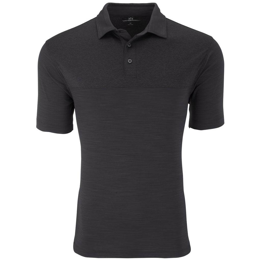 A great custom polo is a must have and the Vansport Men's Black Pro Horizon Polo will not disappoint. The mix of tonal textures offer visual interest to this sporty polo that is made to perform. Whether you need a custom look to play in a golf tournament or something that can serve as corporate apparel when worn with a sport coat. Add a company logo to use this as employee apparel with moisture wicking and UV properties that keeps everyone looking their best as they work their hardest.Corresponding Women's Style: Vansport Women's Black Pro Horizon Polo