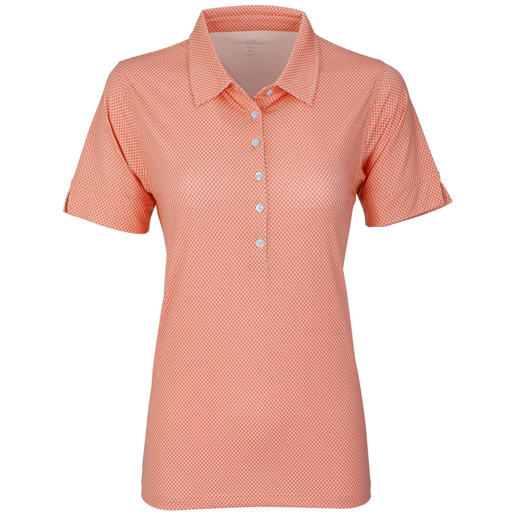 Design a custom embroidery for the Vansport Women's Orange Pro Eagle Polo to create an easy-to-wear look that is ready for the day. The short sleeve polo is lightweight, anti-microbial, and offers UV protection with an all-over diamond print. Hit the putting green, the back nine, or work in this versatile polo.