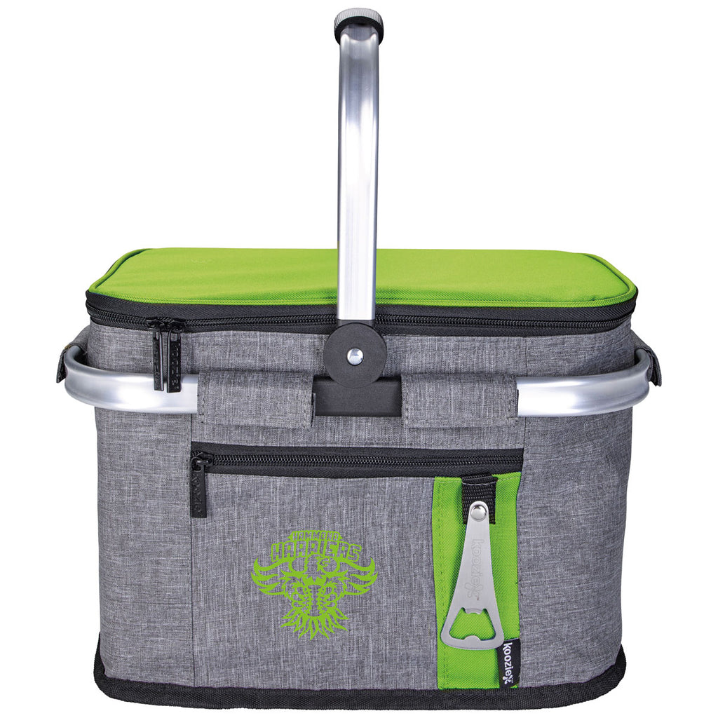 A cool, contemporary design makes the Koozie Lime Collapsible Picnic Basket an excellent way to show off your company's custom logo. Featuring awesome extras like double zippers and a built- in bottle opener, this branded item will make an excellent employee appreciation gift or event giveaway item.