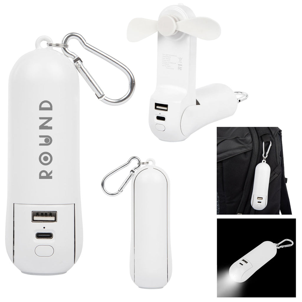 Add a corporate logo to the Hit White Rechargeable Power Bank With Fan & Flashlight to make your customers safer and more comfortable. This convenient power bank is great for hiking, biking, and outdoor activities as you can charge your devices, stay cool in the heat, and have a flashlight if needed.