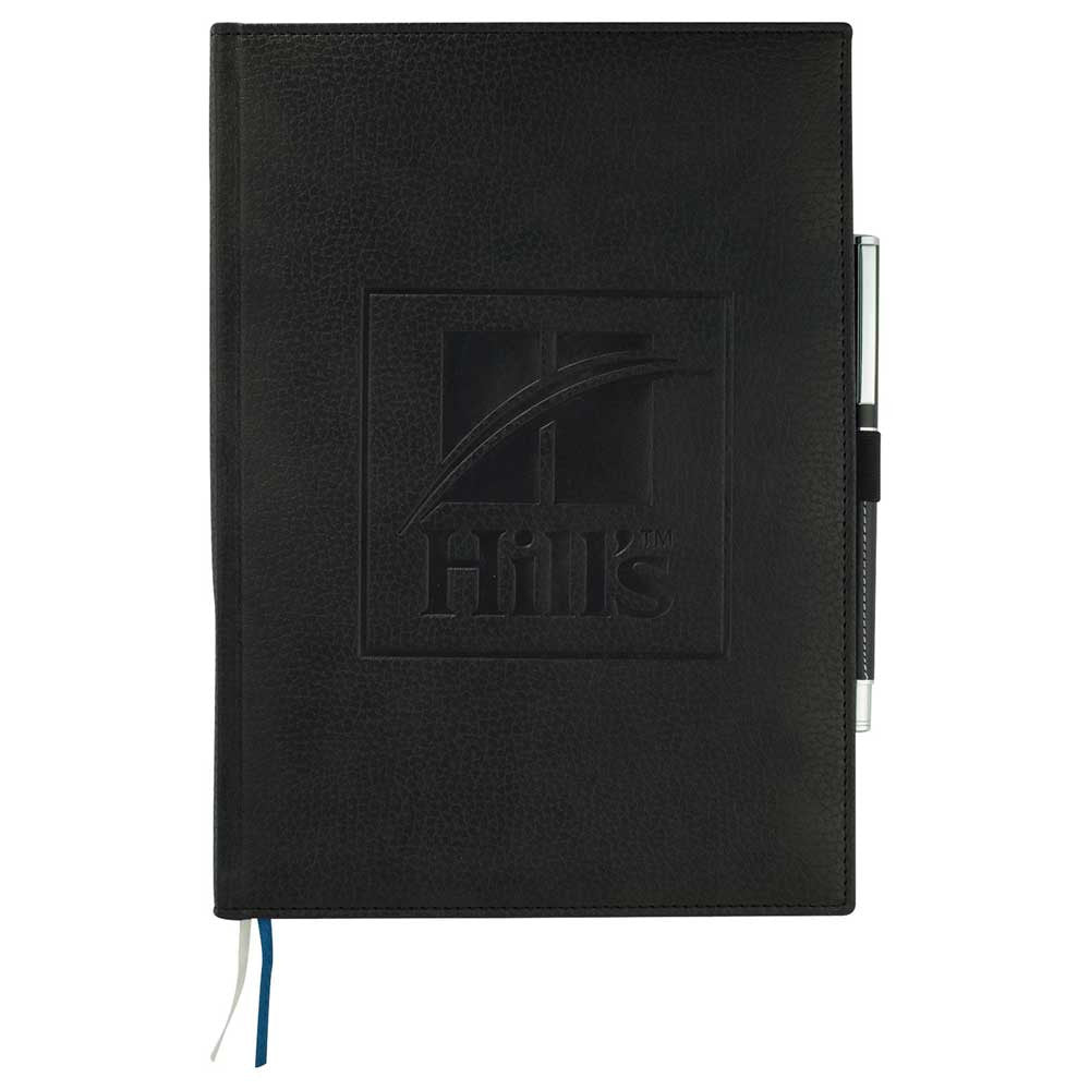 The Black Vicenza Large Bound JournalBook includes a large imprint area of the front elastic closure that presents your unique corporate logo. This business organizer makes the perfect corporate gift during the holidays.