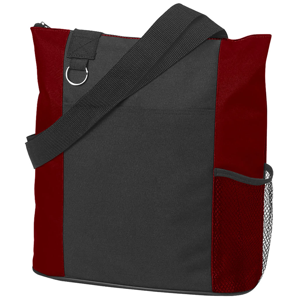 Get organized with the Hit Maroon with Black Fun Tote Bag and your choice of custom screen print. Available in a wide range of colors, this tote has a black shoulder handle and a black center panel with colorful sides. The side mesh pocket is great for a water bottle or keys. Provide these for teachers, nurses, travel, or the morning commute.
