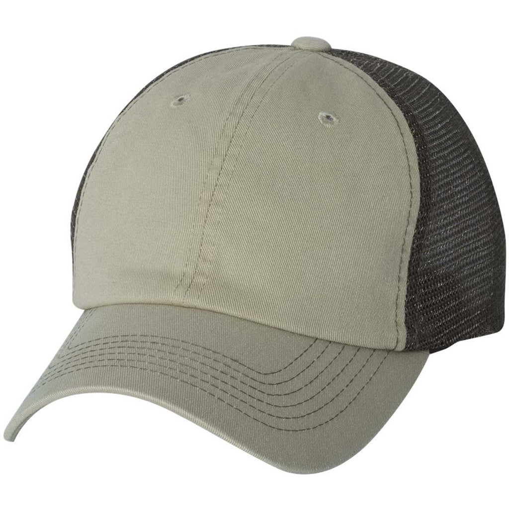 Create a custom classic with the Sportsman Khaki/Brown Contrast Stitch Mesh Cap in a variety of color combinations. Made of cotton and a polyester bio-washed twill front and mesh back, this cap will be an instant favorite for most. The unstructured, six-panel, low-profile fit has a pre-curved visor with matching undervisor and sewn eyelets for a classic cap look. Add a custom embroidery to have custom headwear people will want or a company logo to use this as part of employee apparel. The self-fabric, tri-glide buckle closure means adjusting the size of this cap is a breeze.Highlights